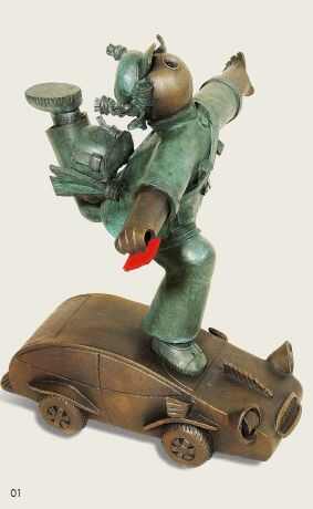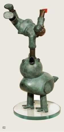 特别需要指出的是,蒋朔的红卫兵雕塑作品夹杂着不少当代流行的时尚元素。高尔夫、卡拉ok、可口可乐、麦当劳和金币、发财、修行以及毫不掩饰的爱情等等,置换了红卫兵手中的红宝书。语境的变化,使原本在现实生活中消失的红卫兵,以艺术的方式移花接木,超现实地将其引入正在进行时的生活。当年曾信誓旦旦要打碎一个“旧世界”的红卫兵,如今则用他们的双手举起曾被他们不屑一顾又深恶痛绝的“东西”。反讽手法的运用无疑强化作品的戏剧效果。然而,在貌似调侃之中,历史也不禁幽默了一把,开了一个意味深长的“玩笑”。其中更别有深层的隐含。作为生命体的人,无法拒绝生逢其时的命运安排,也无法逃避生命延续过程中扮演角色的不断转换。昔日的“红卫兵”创造了一段历史,但生命并未终结的一代人仍在参与并创造着今天。“温故而知新”的“警示”意义,尤以直面当今社会现实的种种现象,仍然具有振聋发聩的作用。雕塑家如此深邃的洞察力,缘自她与她的同龄人一起走出那段“轰轰烈烈”的历史,又走进今天经济腾飞的新时代。她用自己的切身感受见证红卫兵从生到灭、时代的转型与历史的进程。如今理性精神的高扬与复兴,不仅使国家充满活力生机,也拯救了整整一代人的命运和人生。从童年生活的目睹和亲历者,成为今天“红卫兵”系列雕塑的塑造者,蒋朔的作品体现出作者的雕塑艺术不断成熟精进,亦折射出一代人不断蜕变走向成熟的心路历程。