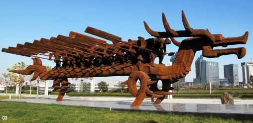 《龙魂》是长达18米的巨型铸钢雕塑,取材于龙舟竞渡的艺术造型,蕴含强烈动感与张力。此雕塑的一比一泥稿制作,工作量很大,作者曾成钢教授,对作品的艺术质量要求近乎苛刻,力求完美,在寒冷的工作间里,在雕塑泥几乎上冻的条件下,每个局部都不放弃,始终以最高标准严格要求,达到了令人震撼的艺术效果。