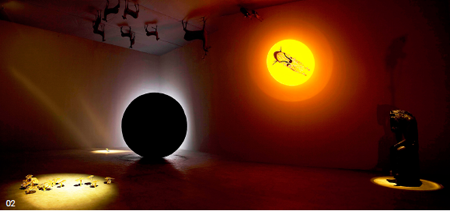 继2008年“苍鑫神话”大型个人展览之后,苍鑫在本次“物性道场”联展中着意营造萨满神秘仪式,使展示空间产生意识转换的效力,其象征性和神秘感对场所的渗透无以复加。展场中心位置是一个草木灰球体,天棚上倒悬一群梅花鹿标本,在朦胧的光影幻境中,仿佛行走在神话故事中的“蓬莱仙境”。灰堆直接呈现火与木相克相生的物态,木的再生之态、火的灵体潜伏所在,意味幻灭与新生交集。梅花鹿象征生命的疗救治愈。萨满教的定义基本上有两点特色:其一是意识转换:从萨满教的脉络来看,意识转换即是出神(ecstasy)状态,出神同死亡一样,暗示着转变(mutation),在这种转变的状态中,平常实在(ordinary reality)和超常实在(non-ordinary reality)之间出现桥梁。ecstasy一字源于希腊字ekstasis,字面意义为放在外面(to be placed outside)或被放置(to be placed),意谓外于或超越自身的状态,即超越平常实在,能够与超常实在沟通。在萨满教中,一般称这种意识转换状态的超常实在过程为萨满旅程(shamanic journey),这与过程艺术理念很相似;其二为疗愈能力:不论萨满得到的是知识或是力量,作为信息的知识或力量都具有疗愈性,可与其他治疗方式搭配,疗愈的指导通常包括疗愈的方式和精灵助手的决定等。萨满所疗愈的对象不只包括自己或他人,也包括大地或世界;萨满疗愈的范围则包含了物质、身体、心理和灵性等各个层面。更精简地来说,萨满教的意义就在于其疗愈功能,不论是治疗疾病或是意识转换,萨满教的目的都在于维持健康和增进健全,所谓健全不仅是指人类、自然以及人类和自然关系的健全,也包括了人类潜能的发掘、自我的完成或大我的实现。因此而不难理解,苍鑫近期的作品材料诸如灵芝、草木灰、鹿茸也属于中药、藏药药材。这些药材的使用,同时在生态学、生态艺术中显现出一种独特作用,艺术家使之成为崭新的文化符号。