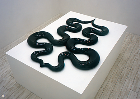 “对称”是人类之于世界的理想认知之一。山本一弥将日常生活中,本身对称的东西选取一点分割,再对称。从而产生类似真实,又非真实的实体。这不是对真实的摹写,而是对想象真实的建构。 “翻版”是这一系列作品的开始,他对于一双鞋子的裁切与重组,产生了一种“似曾相识”的感觉。而这也正是他另一件作品的名字。不仅如此,他还将现实的实在,进行了断然的部分删除,这应该是他有意的取舍。因为,这种取舍使作品摆脱了简单的写实,拥有了在观看过程中不断产生新发现以及想象的快感。而在快感背后,有一股冷冷的进而有些残酷的力量,会在瞬间充满你的视界。展览中的“装饰物”以及“小鹿物语”应是这种感觉的典型作品。初看唯美而平淡,但当你注意到莫名逝去的纤手以及小鹿的头颅,“清酒”的力量已经轰然而至了。