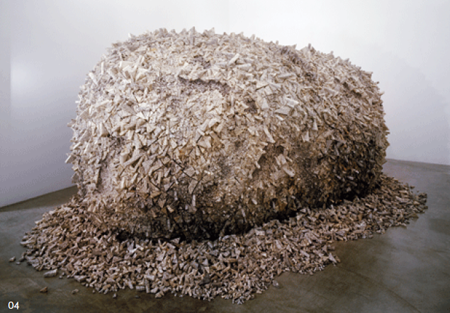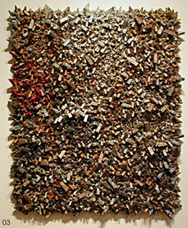 全光荣1944年出生于韩国首尔,在韩国艺术专业毕业后赴美国费城艺术学院(M.F.A., Philadelphia College of Art)继续深造,他在美国、日本、韩国举办过多次展览,其作品强烈的“东方艺术特色”受到西方当代艺术界的推崇。在高科技材料普遍应用于雕塑领域的今天,全光荣选择了一种历史悠久的、传统的韩国手工制纸――桑椹纸。在韩国文化生活的历史中,桑椹制纸扮演了特殊的角色,它几乎贯穿了整个朝鲜王朝,即使在工业文明发展时期,依旧为人民的日常生活所服务,深受韩国普通大众所喜爱。“桑椹纸”,是将桑椹的植物纤维制成纸浆,经过处理成为表面柔软,韧性较好的纸张,它常常作为包装材料、传统韩国绘画用纸。那些成长于20世纪50年代的韩国人可能还会回忆起,桑椹纸出现于日常生活的角角落落,它价格低廉,且用途广泛,很多家庭用它来包裹鸡蛋鱼类等食物,用以保证食物的新鲜,在建筑方面,这种纸还作为墙纸或是用来糊门窗等。在最近的数十年中,韩国的桑椹纸文化几乎消声匿迹,韩国的青少年一代深受西方的影响,电子媒介和新书写手段的冲击,越来越多的年轻人远离了韩文的书写;工业化大生产低廉的成本,冲击了韩国传统手工造纸行业,价格廉价的工业制纸取代桑椹纸而广泛应用于包装、建筑方面,电子通讯技术的发展使人们对书籍的阅读需求减少,使桑椹纸文化更加远离了韩国的现代生活。今天在韩国现代化的都市里,已经很少能够见到桑椹纸的影子。全光荣将这种传统的生活记忆通过雕塑呈现给世界,并加以创造。艺术家将绘有图案的桑椹纸覆盖于聚苯乙烯的表面,形成不规则的多面体,这些多面体成为一切作品形成的基本元素。从点到面再到体,成千上万的“元素”聚合成为有机形体。聚合"Aggregation"这一概念,从语义学上升到了艺术形式的表达。在他90年代的早期作品中,他钻研于创造一种浮雕效果,将“元素”依附于木栅栏之上,形成了凹凸的、如月球表面的效果。随后纸的轻盈飘转,被最大限度地发挥,那些神秘的、遥远的星球浮现出来,如果观者靠近作品会发现,这些小小的元素每一个都复杂而精准,符号,汉字,相互影响构成东方特有的玄学、哲理,而这些物象相互嵌接、榫牟、聚合的成为一个新的有生命力的形体。策展人理查德克莱因Richard Klein指出, “全光荣已经影响了年轻一代的艺术家,他将传统的概念拓展并将其呈现给世界的观众。在他的作品中,文字埋藏于形式之中,构造出了从地面上生长起来的有机物,那些类似于岩石的结晶形成了不朽的、不规则的自然景象,它不仅深刻地嵌入了韩国的艺术史,也成为人类古老的也是现代的生活的反映。”
